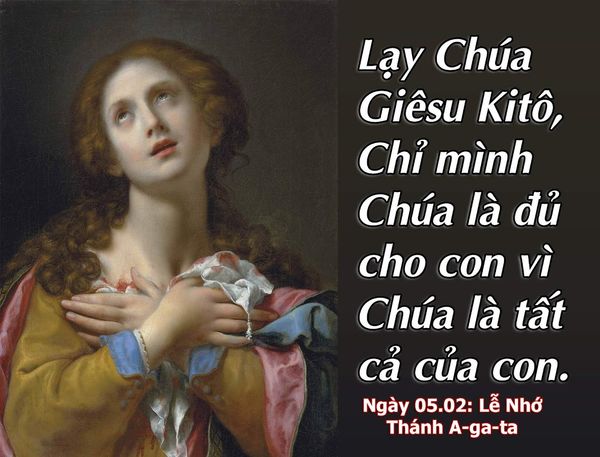 Lạy Chúa, thánh nữ Agatha đã luôn làm đẹp lòng Chúa, vì vừa sống cuộc đời kiên trinh, vừa can trường hy sinh tử đạo. Xin nhận lời thánh nữ chuyển cầu cho chúng con vừa sống trong sạch, ngay chính vừa can đảm đấu tranh cho công lý, hòa bình để chúng con trở nên chứng nhân cho Chúa giữa lòng thế giới hôm nay. Amen.